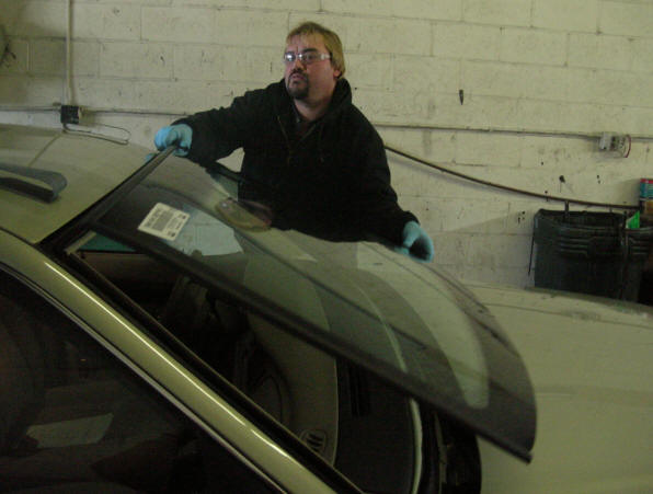 | After applying the adhesive to either the windshield or directly on the pinch weld using urethane caulking, the new windshield is placed on. When this delicate procedure is done, all the hardware is put back on. The vehicle must then setup for several hours before being safe for driving. |